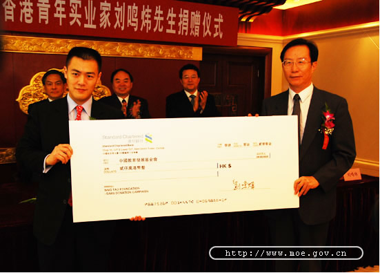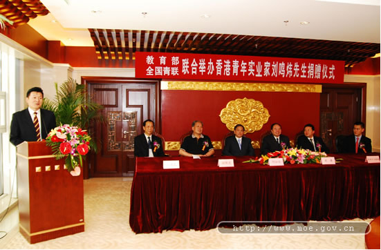 香港青年实业家刘鸣炜向中国教育发展基金会和对外经济贸易大学分别捐赠2000万港币和3000万港币。 教育部部长周济,共青团中央书记处书记、全国青联常务副主席尔肯江•吐拉洪,全国政协常委、星岛新闻集团主席何柱国,香港华人置业集团执行董事刘鸣炜,中国教育发展基金会理事长张保庆和对外经济贸易大学校长陈准民等参加捐赠仪式。 7月4日,由教育部、全国青联举办的香港青年实业家刘鸣炜先生向中国教育发展基金会和对外经济贸易大学捐款捐赠仪式在教育部隆重举行。教育部部长周济,共青团中央书记处书记、全国青联常务副主席尔肯江•吐拉洪,全国政协常委、星岛新闻集团主席何柱国,香港华人置业集团执行董事刘鸣炜,中国教育发展基金会理事长张保庆和对外经济贸易大学校长陈准民等人参加捐赠仪式。 刘鸣炜先生是香港的青年实业家。长期以来,他和其父刘銮雄先生秉承“回馈社会,关怀民生”的精神,迄今已向社会公益事业捐款近20亿港币。此次又向中国教育发展基金会和对外经济贸易大学分别捐赠2000万港币和3000万港币,用于资助内地贫困家庭学生完成学业和学校建设。 此次捐赠得到了全国政协常委、星岛新闻集团主席何柱国先生和商务部廖晓琪副部长的大力协助。 教育部部长周济,共青团中央书记处书记、全国青联常务副主席尔肯江•吐拉洪分别代表教育部和全国青联对刘鸣炜先生的善举表示感谢。