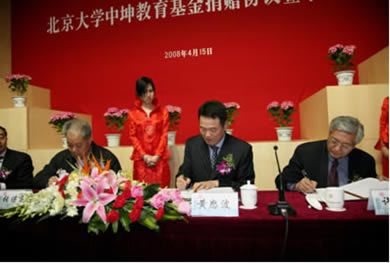 在北京大学即将迎来建校110周年之际,北京大学校友、北京中坤投资集团董事长黄怒波及集团董事会决定重金捐赠,向中国教育发展基金会捐资价值1亿元人民币的地产,在北京大学设立“北京大学中坤教育基金”。 捐赠协议签字仪式于2008年4月15日上午在北京大学图书馆北配殿报告厅隆重举行。中国教育发展基金会理事长张保庆、中坤集团董事长黄怒波、北京大学党委书记闵维方、校长许智宏、副校长岳素兰等出席了仪式,仪式由北京大学党委常务副书记吴志攀主持。 闵维方书记代表学校在仪式上致辞,对长期以来关心和支持北大发展的中坤集团和中国教育发展基金会表示了衷心的感谢。他表示,黄怒波校友的慷慨捐赠将对北大延揽一流人才,促进人文学科发展起到积极的推动作用,同时也会动员更多的北大校友支持学校的发展建设。同时,该基金的设立还将进一步促进中坤集团、中国教育发展基金会与北京大学的合作和友谊,为北京大学的发展注入新的活力。 黄怒波董事长在致辞中表示,作为一名北大校友,为母校发展做出贡献是他最大的心愿和应尽的义务。他认为,技术的进步不等于道德的进步,物质的发展不等于精神的富足,只有抱着“将财富还给社会”的信念,重视道德建设,才能真正走上和谐发展的道路。他表示今后将继续支持母校建设,为北大创建世界一流大学做出自己的努力,同时也呼吁能有更多的北大人加入到关怀母校建设的行列中来,希望“北大人永远不要忘记自己肩负的社会责任”。 中国教育发展基金会张保庆理事长在讲话中高度评价了黄怒波先生对北京大学乃至中国高等教育事业做出的巨大贡献,他相信黄怒波先生的举动会影响和带动更多有识之士关注和支持中国教育事业的发展。他同时表示,中国教育发展基金会将尽力确保此项基金的落实和运行。 黄怒波董事长、张保庆理事长和许智宏校长作为三方代表共同签署了捐赠协议。根据协议,“北京大学中坤教育基金”将主要用于设立“北京大学中坤优秀教师奖励基金”、“北京大学中坤优秀学生奖学金”、“北京大学中坤海外交流基金”等项目,支持北京大学人文学科的发展以及人才培养事业。仪式结束后,许智宏校长代表学校向黄怒波校友赠送了纪念品。 黄怒波校友毕业于北京大学中文系,笔名骆英,是一位成功的企业家,也是一位才华横溢的诗人。他的诗集《不要再爱我》、《拒绝忧郁》、《落英集》、《都市流浪集》等以强烈的人文关怀和深厚的文化底蕴,在诗歌界广受赞誉。1995年,黄怒波创办了北京中坤投资集团有限公司并担任董事长,从商而不弃文的他凭借着诗人特有的文化气质将中坤集团带入了一条兼具人文视野与商业盈利的道路,取得了巨大的成功。目前中坤集团总资产规模达100多亿元人民币,在地产、旅游和旅游地产开发领域独树一帜,被誉为中国成长最快的民营企业之一。 在积极开展商业经营的同时,中坤集团秉着“让我们为社会再多做一些” 的企业文化宗旨,积极参与社会公益活动。据统计,中坤集团就社会文化活动、宗教事业、教育事业、体育活动、医疗卫生、支援灾区等方面累计捐款近2亿元人民币。作为北大校友,黄怒波有一种浓厚的北大情结。自1998年百年校庆开始,他先后在北大捐资设立“中坤学术发展基金”、“中坤诗歌发展基金”以及“中国传统文化研究基金”等,并多次支持母校举办诗歌会、诗歌节,为北大的建设与发展做出了宝贵的贡献。