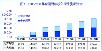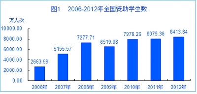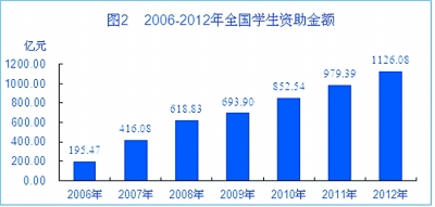 据统计,2012年,全国累计资助学前教育、义务教育、中职教育、普通高中和普通高校学生(幼儿)共8413.84万人次(不包括义务教育免费教科书、营养改善计划资助人数),比2006年增长2.16倍(见图1)。累计资助金额1126.08亿元(不包括义务教育免费教科书、营养改善计划资金),比上年增加146.68亿元,增长14.98%,比2006增长4.76倍(见图2)。(注:本报告2006-2012年全国资助学生数与金额包括国家助学贷款贴息)