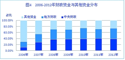 2012年,财政投入资助资金共824.74亿元(见图3),占当年资助总额比例达到73.24%(各年度占比见图4)。财政投入比上年增加126.32亿元,增长18.09%,比2006年增长13.4倍。其中,中央财政432.73亿元,比上年增加36.69亿元,增长9.26%,比2006年增长19.26倍;地方财政392.01亿元,比上年增加89.63亿元,增长29.64%,比2006年增长9.92倍。