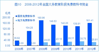 此外,2012年,义务教育阶段共有1.3亿学生享受国家免费教科书,受助学生比例(占义务教育阶段学生总数)88.29%,资助金额161.41亿元(其中包括汉语字典资金17.35亿元,见图10);0.94亿学生享受地方免费教科书,资助金额25.81亿元;全国22个试点省份的680个国家试点县及新疆生产建设兵团19个团场近10万所学校开展营养改善计划,资助学生约2288万人,中央安排当年膳食补助资金150.53亿元(包括地方试点中央奖补资金15.41亿元);15个省份在481个县开展了地方营养改善计划试点工作,覆盖学校约3.6万所,资助学生约870万人,地方财政安排膳食补助资金34.54亿元。(本报告由全国学生资助管理中心发布)