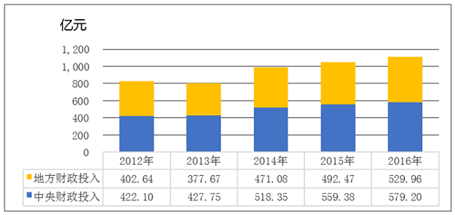 年财政投入资金从2012年的824.74亿元,增长至2016年的1109.16亿元,增长了34.49%,年均增幅7.69%。其中,中央财政年投入资金从2012年的422.10亿元,增加至2016年的579.20亿元,增长了37.22%,年均增幅8.23%;地方财政年投入资金从2012年的402.64亿元,增加至2016年的529.96亿元,增长了31.62%,年均增幅7.11%。