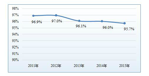 “十二五”期间通过工程教育专业认证的工科专业毕业生一次就业率变化情况