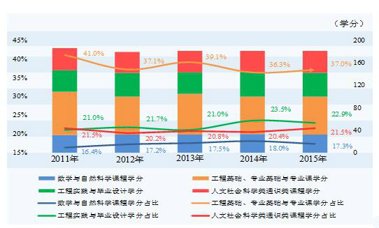 工程教育不断调整课程模块,呈现工科特色,人文社会科学类通识课程模块受到重视,课程设置更关注对学生通用能力的培养,工程实践与毕业设计模块学分及占比有所上升,毕业设计(论文)更加体现工程性,反映专业更加注重对学生工程实践能力的培养。