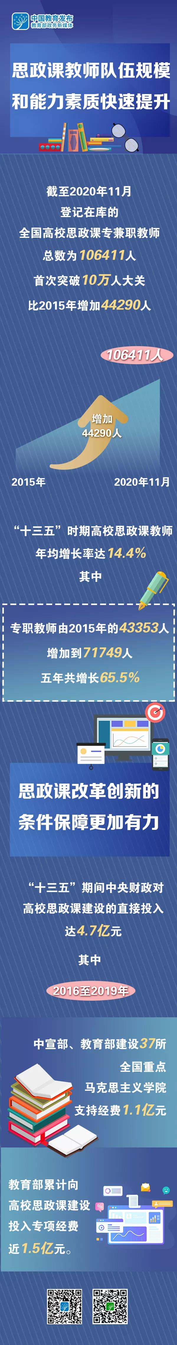 办好思政课,关键在教师。截至2020年11月,登记在库的全国高校思政课专兼职教师总数为106411人,首次突破10万人大关,比2015年增加44290人。“十三五”时期高校思政课教师年均增长率达14.4%,其中专职教师由2015年的43353人增加到71749人,五年共增长65.5%。