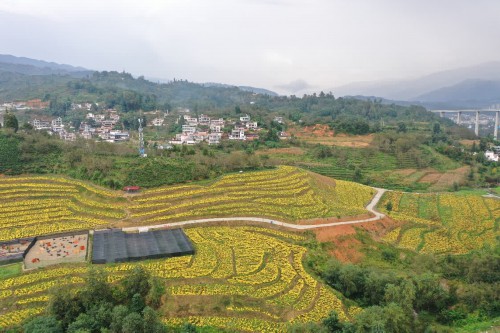 这里是“中山大学产业帮扶项目高原生态金丝皇菊种植基地”,与不远处的云保高速清水河大桥遥遥相望,不少游客正是为遍山的菊花而来。