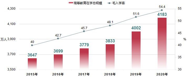 2020年,全国共有普通高校2738所。其中,本科院校1270所(含本科层次职业学校21所);高职(专科)院校1468所。各种形式的高等教育在学总规模4183万人,高等教育毛入学率54.4%。