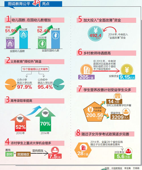 从中央到地方,从沿海到内地,增加教育经费投入、新建扩建幼儿园、推进义务教育均衡发展、大力发展职业教育、全面提高高等教育质量这些一步步跨越的背后,一条教育公平的求解之路逐渐清晰而明朗。