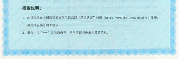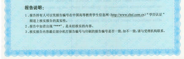 2012年4月5日起,《中国高等教育学历认证报告》(纸质版)下方的“报告说明”文字进行调整(如下图),其它样式无明显变化,特此声明。